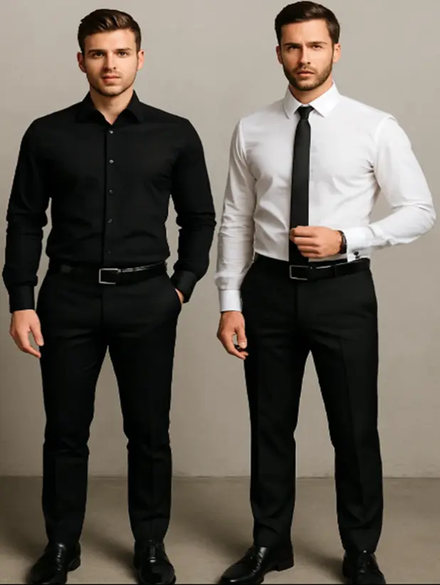 A white shirt with black pants or light blue shirt with navy pants is considered perfect. Keeping it nominal and sharp.