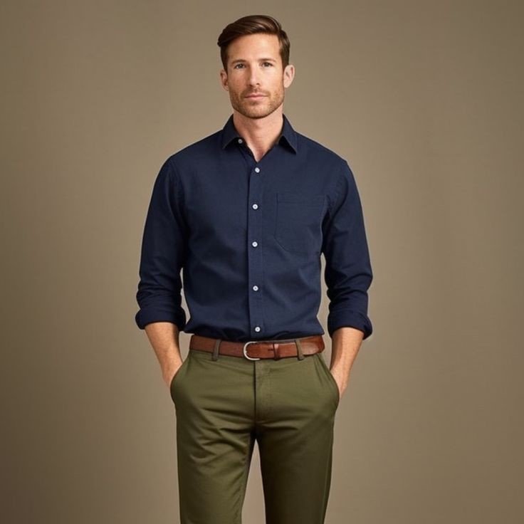 - Dark blue shirt with khaki pants – semi-formal choice.