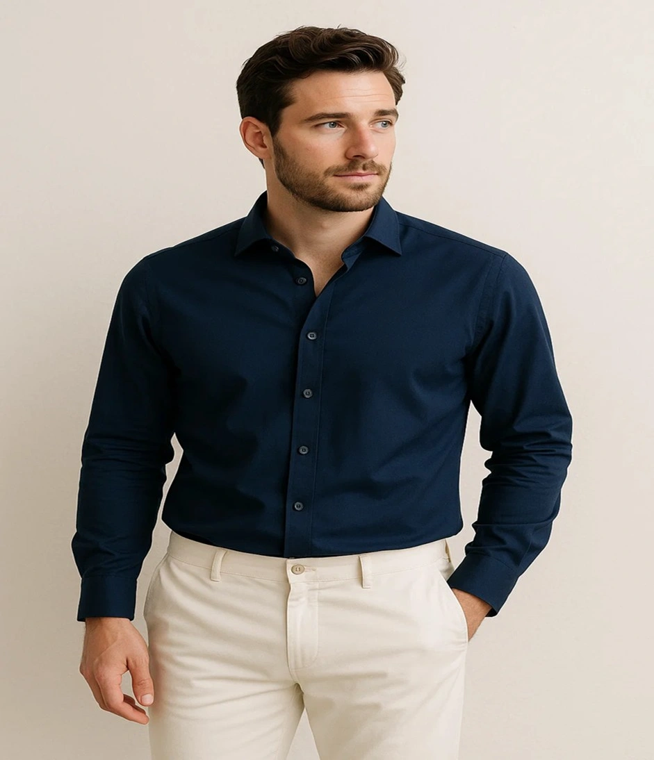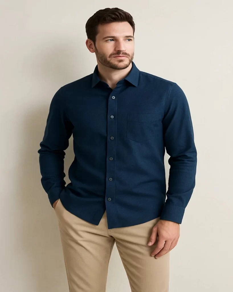 In semi-formal or smart casual settings, beige chinos, cream trousers, or khaki pants accompany the dark blue shirt attractively, providing a lighter contrast that equilibrates the deep shade. This pairing works particularly well for summer occasions, creative workspaces, or corporate get-togethers, where style and coziness both matter. A brown belt and loafers or polished casual shoes improve the look without making it overly formal.