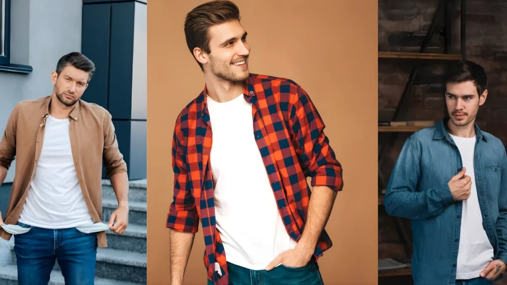A white t-shirt, blue jeans, and a checked or denim shirt are the most timeless combinations. For a braver appearance, try a black t-shirt with dark wash jeans and a light-coloured shirt like beige or olive.